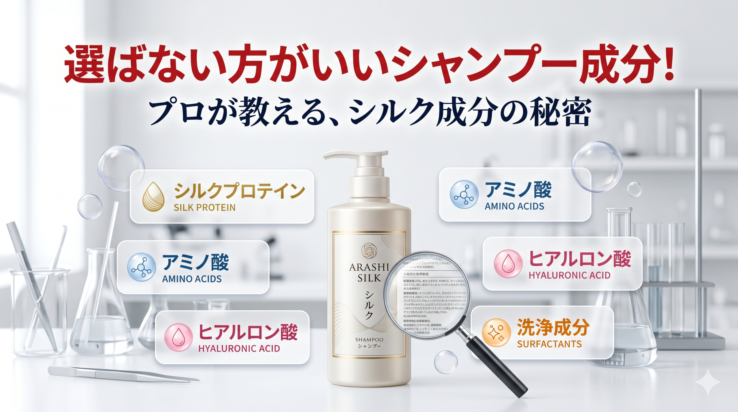 加水分解シルクも同様に、毛髪の滑らかさ・光沢・保湿に優れた成分です。これらが成分表示の中盤以内に入っていれば、品質の高いシャンプーと判断できます。